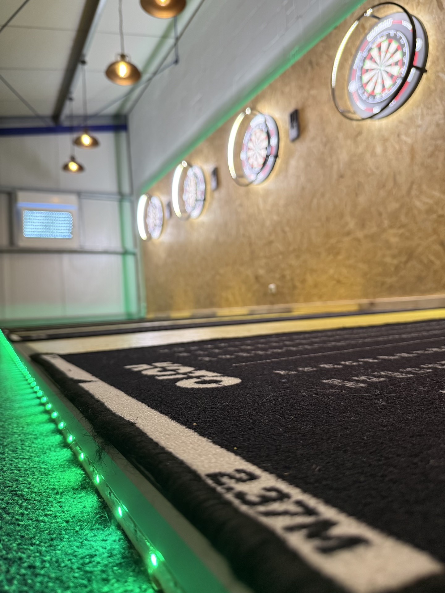 Der Dartraum ist mit seinen 25 m² klein, aber fein – und ideal für bis zu 10 Gäste. Ausgestattet mit fünf modernen Winmau-Steelboards, LED-Beleuchtung und digitaler Spielstandsanzeige bietet er beste Voraussetzungen für spannende Matches. Dartpfeile sind vor Ort vorhanden, sodass direkt losgelegt werden kann.
